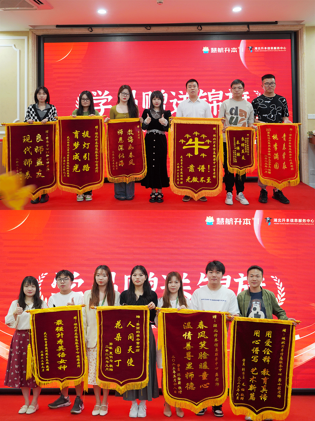 湖北升本信息服务中心教师团队始终以不断提高精进教学质量、不断优化服务水平、不断贴提高学生成绩,不断贴近学生内心为主要任务和教务理念,老师们的付出学生都看在眼里,学生对教师的感谢也蕴含行动当中,当一面面代表着感恩和认可的锦旗送到老师手中时,本次表彰大会也悄然接近尾声。这已经湖北升本信息服务中心成功举办的第十届优秀学员表彰大会,未来我们将延续这一传统,给更多学员以启迪和力量,我们也将始终保持教育的初心,严格把控教学质量,助力更多学员圆梦本科。