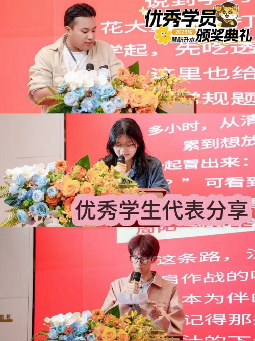 同时,获奖学员代表也上台分享了自己的升本经验。他们毫无保留地讲述了自己的备考规划、遇到的困难与解决方法,以及如何调整心态应对压力。他们的经历真实而励志,为其他学员树立了优秀的榜样,也让大家明白,只要坚持努力,就一定能收获属于自己的成功。