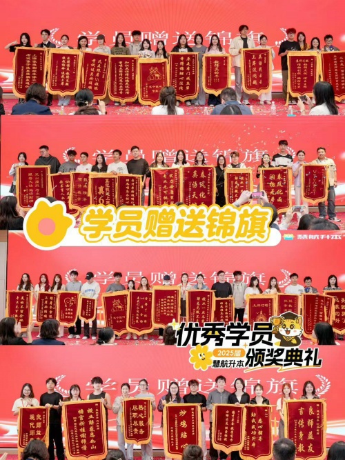 在温馨的氛围中,学员代表们手捧锦旗走向老师们,“良师益友,桃李芬芳”“专业教学,助力升本”…… 锦旗上的每一句话,都饱含着学员们对慧航升本及老师们的感恩之情。这一面面锦旗,不仅是对慧航教学质量与服务的高度认可,更是师生之间深厚情谊的见证,让现场所有人都感受到了这份温暖与感动。
