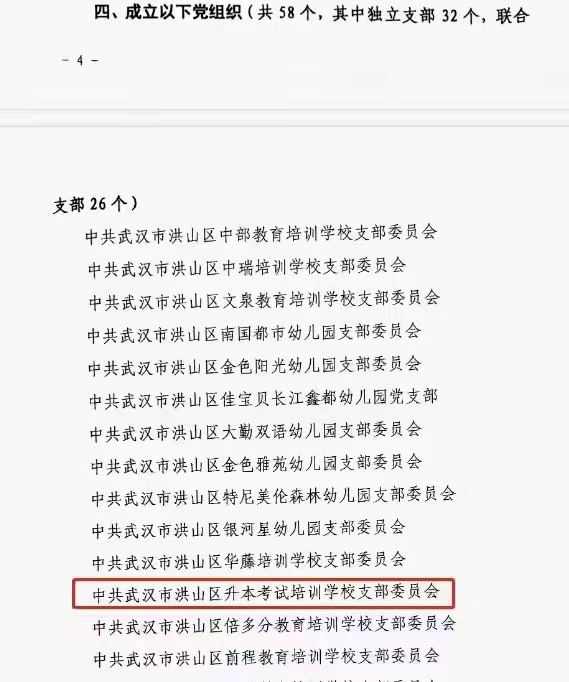 历经数月筹备和考核,2022年7月1日,正值中国共产党建党101周年之际,经上级党组织工作委员会审核决定,我校正式成立中共武汉市洪山区升本考试培训学校支部委员会,并由中共武汉市洪山区教育局委员会颁发《关于调整洪山区民办教育行业党组织设置的通知》,罗代华同志任党支部书记。